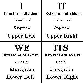 Theory of Everything: If you have been following progress in theoretical physics, you know that a “theory of everything”—from which could be derived “every known particle and force in the cosmos”—has been the physicist’s holy grail for some years now. Unfortunately, although such a theory would shed light on primary physical processes, it would do little to help us understand the complex milieu that developed out of those processes. In his latest book, A Theory of Everything, Ken Wilber draws on several decades of insightful model building (his own models and those developed by others) to create a much more comprehensive “theory of everything.” Wilber’s map of reality embraces the entire mental-physical “Kosmos,” not just the particle-physics aspect of it. Wilber uses this word Kosmos because it meant for the Greeks “the patterned Whole of all existence, including the physical, emotional, mental, and spiritual realms. Ultimate reality was not merely the cosmos, or the physical dimension, but the Kosmos, or the physical and emotional and mental and spiritual dimensions altogether. Not just matter, lifeless and insentient, but the living Totality of matter, body, mind, soul, and spirit.” A Theory of Everything should interest two very different groups of readers. For those new to Wilber’s ideas, it provides a short (189 page) summary of his model of the Kosmos and his current thinking about it. For those who have been following his work for years, it represents an expansion into new territory. In this book, Wilber links his explanatory schemata to real-world problems and situations, and in doing so presents a convincing case that only an integral approach to personal and societal development will get humanity through the difficult times ahead. The basic realities that Wilber addresses in his theory building are a primal ground-of-everything reality that he labels Spirit, and the progressive development of mental and physical expressions of Spirit. Wilber has grouped Spirit’s manifestations into Interior-Individual I, Exterior-Individual IT, Exterior-Collective ITS, and Interior-Collective WE. As shown in Figure 1, crossed X and Y axes provide the basic framework for presenting this. Figure 1 — Wilber’s Four-Quadrant Structure The point where the two axes cross, the graph’s origin, also represents the origin of all development. And progressive development in all quadrants can be pictured as a series of ever-larger concentric circles having the origin as their common center. Wilber often represents different levels of this outward, developmental, evolutionary movement by using diagonal lines with tick marks on them. An example is Figure 3-1, an illustration from this latest book. It relates one aspect of inner development—a gradually-broadening sense of self—to Don Beck and Christopher Cowan’s color-coded “memes,” “waves,” or stages, of human development, and relates them to social and cultural development. Figure 3-1. Some Examples of the Four Quadrants in Humans No single graphical expression is able to tell the entire story that Wilber wants to tell, but by using multiple graphs of this kind, and tailoring the details to suit the situation, he is able to help us understand a variety of Kosmic truths. (For a more detailed look at this approach, Wilber recommends his books Integral Psychology and A Brief History of Everything.) Beck and Cowan’s “Spiral Dynamics” model of human development is one of the core elements in A Theory of Everything. Concerning it, Wilber says, “Memes (or stages) are not rigid levels but flowing waves, with much overlap and interweaving, resulting in a meshwork or dynamic spiral of consciousness unfolding.” Wilber points out that the overall developmental spiral involves many developmental “streams, lines, or modules” and that “this added dimension gives a new richness to the developmental landscape.” Among the most important of these lines and streams are the self-identity stream illustrated in Figure 3-1, and streams involving cognition, morals, and socio-emotional capacity. Development in the various streams does not necessarily occur at the same rate. A problem that Wilber calls Boomeritis occurs when a high level of development (green—sensitivity) in the cognitive and moral streams is accompanied by a low level of development (red—egocentricity and narcissism) in the self-identity stream. Regarding the green stage or wave, he refers to Paul Ray’s study which estimates that there are some 45 million “Cultural Creatives” in the U.S.—people who resonate with integral values. Wilber believes that the great majority of these people are at the green meme stage in tier 1 of the developmental process, not at the yellow “autonomous or integrated stage” in tier 2. Research indicates that less that two percent of Americans are at tier 2, leading Wilber to say, “Almost anyway we slice the data, the ‘integral culture’ is not that integral.” Yet Wilber goes on to say, “But it can be. And that is the crucial point. As the cultural creatives move into the second half of life, this is exactly the time that a further transformation of consciousness, from green into mature second-tier awareness, can most easily occur.” Wilber identifies four factors that facilitate personal transformation: fulfillment, dissonance, insight, and opening. “Fulfillment means that the individual has generally fulfilled the basic tasks of a given stage or wave.” When this happens the person “is open to transformation” which is then facilitated by some sort of dissonance. “The new wave is struggling to emerge, the old wave is struggling to hang on, and the individual feels torn, feels dissonance, feels pulled in several directions.” Eventually, out of the dissonance comes “insight into the situation—insight into what one actually wants, and insight into what reality actually offers. … Fin