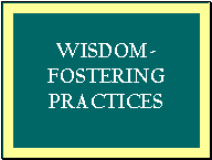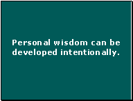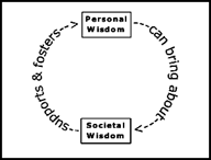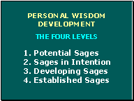 Scholars throughout the institution would bring their perspectives and expertise to the task. And students would bring their interest, energy, fresh approaches, and penetrating questions. In single-discipline classes and multidisciplinary teams, teachers and students would explore aspects of the problem. Ideas for solutions that came out of these investigations would be subjected to group review. Through constructive criticism, the originators of the ideas would be helped to strengthen the viability of their proposals, and see any fatal flaws. The emerging basketful of ideas would be shared with the entire school at the end of the year — perhaps in a symposium, or an easily produced print-on-demand book, or both. We’re going to move shortly to the development of personal wisdom, but first I’d like to touch on the back-and-forth relationship between the personal and the societal. It starts with personal wisdom. If a societal institution ends up being guided by wise values, it is almost certainly because wise people designed them in. So there is a creative movement from wise people to wise institutions. But it also works in the other direction. Wise societal institutions support and encourage the development of wisdom in individuals. One reason why high levels of wisdom are not commonplace is that each person starts from zero. The potential for wisdom may be there in the genes, but its actualization is not quick or easy — let alone automatic. Wise institutions, on the other hand, carry their wise values from generation to generation. Clearly, the more of these institutions there are, the greater the influence they exert, and the greater their effect on the development of personal wisdom. In the late 1990s there were meetings in Burkina Faso of a “Council of the Wise.” This was a group of people from different countries and backgrounds who wanted to foster the development of wisdom in African culture. A useful outcome of these meetings, and a good starting point for our next topic, was the identification of four levels of wisdom development. POTENTIAL SAGES includes almost everyone. These are busy people who have the potential to become wise, but have never felt the call to intentionally develop wisdom themselves. SAGES IN INTENTION have come to understand what wisdom is, realize that they have the potential to become wise, and have decided, as the Council put it, to “follow the path of their potential.” DEVELOPING SAGES are actively involved in wisdom-development activities. ESTABLISHED SAGES are those who are recognized by others as wise people. My hope is that here at Rollins College and elsewhere, activities could be put in place that would allow many students to reach the SAGE IN INTENTION level, and perhaps some to reach the DEVELOPING SAGE level. Naturally, in a wisdom-fostering milieu, faculty members would be getting wiser too. As I have come to understand it, we become wiser people in two ways: