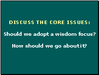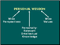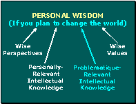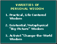 The plan for the evening is this: I’ll spend about 45 minutes presenting my thoughts on these topics. Then we’ll assemble the panel here on stage, and open the mikes for a general discussion. I’ll be using slides to illustrate some points and to mark the change of topics, but won’t be bombarding you with visuals. You may have had a chance to glance at the handout. It’s not intended to be a “follow along” document during the talk. Instead, its purpose is to help you further explore the idea of wisdom, should the talk stir your interest. It contains some material from the talk, plus pointers to other resources you might want to check out. People have been interested in wisdom for a long time. In the East, we can look back to the Upanishads, the teachings of the Buddha, Confucianism, and Taoism. In the West, it began with a few Sumerian and Egyptian texts, followed by the Old Testament prophets, the Greek philosophers, the Christian gospels, and the theologians of the Middle Ages. The views of wisdom presented by these writers differ in detail. But they are consistent in the idea that wisdom is desirable and, in some sense, superior to ordinary. In the 20th century — for reasons not yet clear — the term wisdom fell out of common usage. People used words like excellence, intelligence, cleverness, aptitude, proficiency, and brilliance that danced around the edges of wisdom, but they avoided the term itself. For much of the 20th century, wisdom was also out of favor in academia. Despite the fact that philosophy literally means love of wisdom, as we've already heard, wisdom was not considered a suitable subject for scholarly study. That began to change about 1980, and since then reports on 36 wisdom research studies have been published. Back in 1995 I started THE WISDOM PAGE at this simple address: www.cop.com. It’s an online source of wisdom resources. One item you can find there is a doctoral dissertation by Richard Trowbridge. It discusses all 36 of those studies, so if you happen to be interested in that, you might want to go there. Interestingly, one of the reviewers of the dissertation was Rollins’s own Karl Peters, for many years Professor of Philosophy and Religion here, and currently Professor Emeritus. Interest in wisdom now appears to be growing in the general population as well as academia. During the past year the number of Web pages worldwide has grown by about 200%. During that same period, however, the number of Web pages containing the word wisdom grew by 1200% — to a present total of more than 170 million pages! What is personal wisdom? Like stupidity, we know it when we see it. But because wisdom manifests in so many different ways, it can’t be adequately defined in a few words. Short dictionary definitions of it highlight some of wisdom’s characteristics such as “keen discernment,” “a capacity for sound judgment,” and “the ability to discern inner qualities and relationships,” but they don’t really get to the heart of the matter. Here’s my take on personal wisdom. At every moment in our lives we face some Real-Life Situation, some fact-based reality. But what do those facts mean? And what’s the best thing to do about them? Wisdom answers the meaning question by looking at the situation from a variety of helpful perspectives. It answers the action question by bringing wise values into the decision-making process. There are many of these “wise ways of seeing,” and many “wise values.” In wise people these basic building blocks of wisdom combine in various ways to create an array of “wise attitudes” and “wise ways of being.” And because the mix of characteristics differs from person to person, each wise person’s wisdom has a distinctive character or “flavor.” A key point is that personal wisdom is internal, embodied by persons. Words of wisdom arise from it. Wise behavior arises from it. Socio-Cultural wisdom arises from it. But wisdom itself is not its products. Rather, wisdom is a mode of cognition — one that couples relevant intellectual knowledge with some important perspectives, interpretations, explanatory frameworks, and values. As I see it, wisdom is a kind of meta-knowledge that helps us make better sense of the rest of our knowledge. Aristotle differentiated between two kinds of wisdom: practical wisdom, and existential/metaphysical wisdom. I would add a third variation on the theme: activist, change-the-world wisdom. Life-centered wisdom is an information-processing modality — one in which everyday situations are evaluated comprehensively, from many different points of view. Howard Gardner wrote, “The defining characteristic of wisdom is the breadth of considerations taken into account when rendering a judgment or recommending a course of action.”1 Let me give you an example. In a particular situation Wisdom might ask: Will this work? What are the consequences? Does this fit with my goals? Is this part of the problem or part of the solution? Does this represent excellence? Is this fair? Is it right? Is action needed or not needed? — and possibly many others. Big picture, existential wisdom is a variety that Eastern spiritual practices help to develop. Rational evaluation still plays a role in this form of wisdom, but rationality is not enough. That’s because the goal is insight into both the informational aspect of reality (that is, form and appearance) and the noninformational aspect (which has been called Being and Spirit traditionally, and I would use the terms Energy and Awareness). Eastern practices develop and harness the psychological modalities of intuition and identification. These modes of cognition potentially allow us to see beyond the transient to the eternal. Beyond Maya to Brahman. Beyond form to the carrier of form. Activist wisdom starts with a well-developed foundation of personal wisdom. But the wise person who wants to change the world adds to that foundation an intelle
