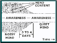 We need to know our place in the universe. How can students develop the ability to look at their lives from this contextual vantage point? We also need problem-solving skills — generalized skills that we can apply to any problem we encounter. They are taught in some disciplines, such as engineering, but many college students are never exposed to them in a systematic way. What might be done here? Let’s move now to practices. Becoming clear about the values we want to make truly our own in a deep and powerful way is an important first step. But we then need to move those values from our head to our guts and our heart. In psychological terms, we must internalize them so they are not merely nice thoughts, but actually guide our behavior. Doing this takes effort, and during one of his trips to North America the Dalai Lama gave an example of what we need to do. He spoke to an audience about the need to develop that key value of wisdom, compassion. His advice to those who wanted to develop compassion was to put themselves in challenging situations and then, despite the natural reluctance to do so, behave compassionately. By making the effort to engage in value-based action — again, and again, and again — we eventually internalize the value. Expressing the value in action gradually takes less and less effort until it becomes part of our outlook, part of our natural way of being, part of who we are. The existing academic structure already helps students to practice some of the important values of wisdom. Examples include aspiration, honesty, diligence, responsibility, self-discipline, critical thinking, determination, completion, and truthfulness. The new Academic Honor Code that goes into effect this coming fall, and the enforcement mechanisms that go with it, are bound to further the process of moral development. Honesty, truthfulness, personal integrity, and moral conduct — often background issues — will be in the foreground of student consciousness much more of the time. How about other important values of wisdom? What kinds of existing or new academic structures could be used to help students internalize them? Take courage and cooperation, for example. To help students develop new levels of courage, willingness to risk, and teamwork would it be appropriate to introduce group adventure or high wire activities? There are many other practices that could be of value to students — stress reduction practices, body awareness practices, attention-development practices and others. Here I’d like to focus on one particular practice. I have much personal experience with it, and it strikes me as germane to a wisdom-development program here at Rollins College. I refer to meditation — but meditation as a psychological practice, removed from any association with religion. In my experience, and that of many other people, meditation is the single most powerful tool for developing wisdom. Ken Wilber noted that “Less than 2 percent of the adult population scores at Jane Loevinger’s highest two stages of self development (autonomous and integrated),” and he went on to say, “No practice (including psychotherapy, holotropic breathwork, or NLP) has been shown to substantially increase that percentage. With one exception: studies have shown that consistent meditation practice over a several-year period increases that percentage from 2 percent to an astonishing 38 percent….”10 Starting a meditation practice with five minute sessions, or 30 minute sessions, is often discouraging. That’s because, early on, the student doesn’t see much in the way of results. In my experience, the way around that problem is to start with a 7-to-10 day meditation retreat. In our culture we fill our waking hours with discursive thinking. We think about the past. We think about the future. We plan. We solve problems. That’s fine. But it means that in our busy, buzzy, world our mind is almost always busy and buzzy. It’s a noisy mind, full of high-amplitude informational content. This graphic might help get the idea across. At the left we have the usual noisy-mind situation. Pure quiet awareness is there as the substrate or the ground of mind, but it is modulated by a lot of high-intensity information — thoughts, sensations, emotions — much mind content. At the right, the graphic depicts the quiet mind. This is not sleep. The person is highly alert and aware, but the quantity and intensity of mental information is way down. The transitional slope between one state and the other depicts what happens during the first 3 or 4 days of a meditation retreat. The key to going from a noisy mind to a quiet mind is not just to tell someone to stop thinking — it just doesn't work — but to pay attention to something subtle. Now why would that be? Because we can’t think discursively and pay close attention at the same time. In a sense, the noisy mind is a habit. A quiet mind is a different kind of habit. It turns out that if we spend several days paying attention to subtle bodily sensations — like those arising in the nostrils when the body is just naturally breathing, and those arising in feet and legs when we walk — the mind gradually shifts from habitual noisiness to habitual quietude. It usually takes 3 to 4 days of diligent morning-to-night effort in a supportive environment to make the switch. A week-long retreat would allow students to taste the benefits of meditation. A quiet mind not only introduces the practitioner to a profound inner peace, it also facilitates communication with the subconscious. This in turn leads to greater self-knowledge and greater creativity. Moreover, the high level of attentiveness, coupled with freedom from content overload, leads to a clearer understanding of how the mind works. I discuss all this in my books Toward Wisdom and Matters of Consequence. And I’ve put some excerpts from those books on line. Again, check THE WISDOM PAGE. Could a “Quiet Mind Week” be an